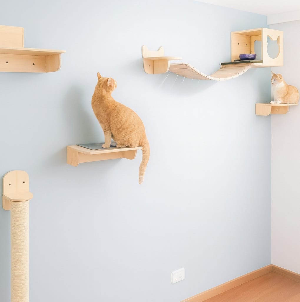 Set de pared completo en madera natural: túnel decorativo, puentes, repisas y rascadores. Ideal para gatos activos que aman trepar y explorar, manteniendo tu casa fresca y con estilo