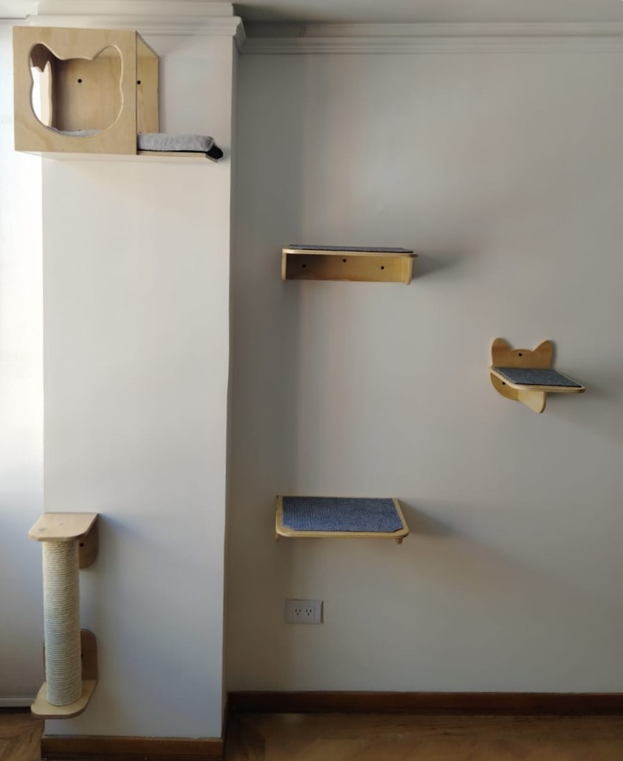 Este set es perfecto para gatos que adoran las travesías en altura. Incluye una casa de piso largo que se convierte en un punto de observación, dos sofás intermedios que incentivan el movimiento constante, un sofa pequeño y un rascador mediano. Cada pieza está hecha en madera contrachapada de pino, con acabados resistentes y elegantes que armonizan con cualquier ambiente. Proporciona a tu gato un espacio para trepar, rascar, vigilar y descansar, convirtiendo tu pared en un auténtico circuito de exploración felina.