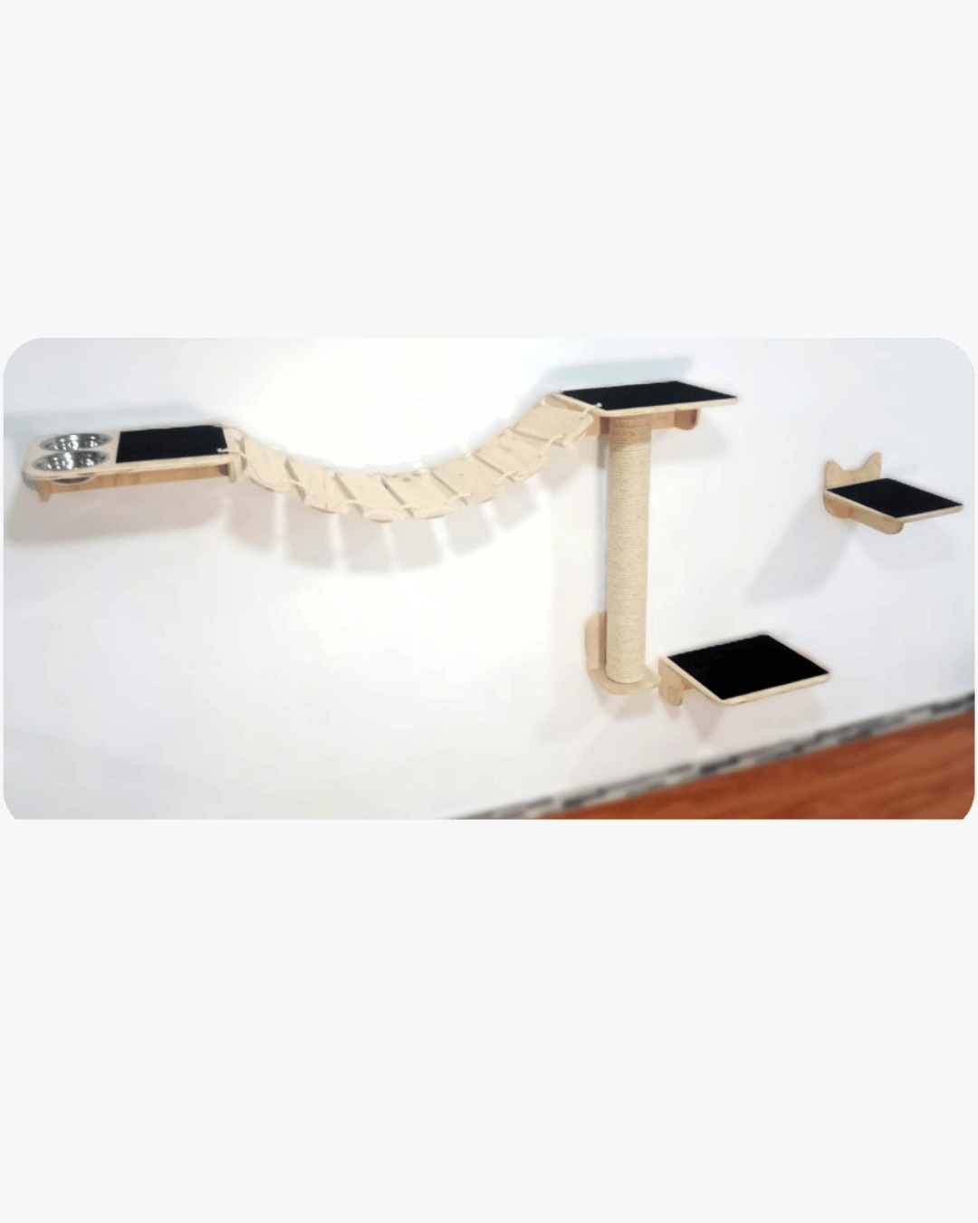 Este set es perfecto para gatos que adoran las travesías en altura. Incluye un puente colgante que une un punto de observación, un sofá comedero bebedero un rascador robusto y sofás intermedios que incentivan el movimiento constante. Cada pieza está hecha en madera contrachapada de pino, con acabados resistentes y elegantes que armonizan con cualquier ambiente. Proporciona a tu gato un espacio para trepar, rascar, vigilar y descansar, convirtiendo tu pared en un auténtico circuito de exploración felina.