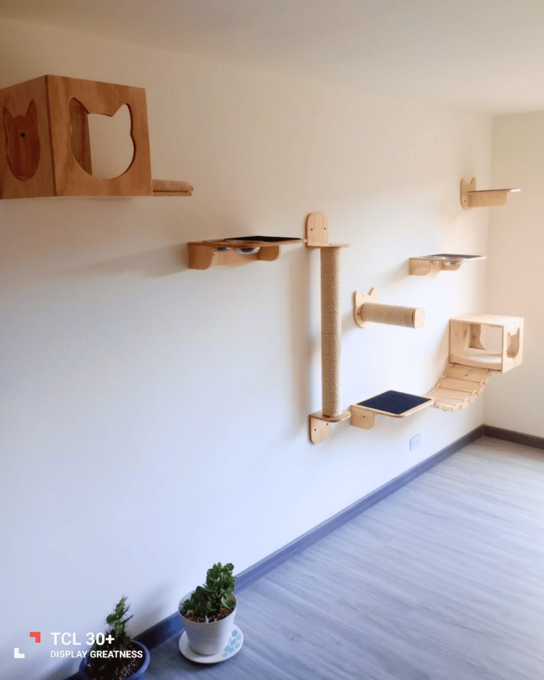 Este set es perfecto para gatos extremos que aman las alturas. Incluye 2 casas, una como refugio en lo más alto y otra como punto de observación, 4 sofás de transito, un puente colgante que une dos puntos de observación, y 2 rascadores horizontal y vertical. Cada pieza está hecha en madera contrachapada de pino, con acabados resistentes y elegantes que armonizan con cualquier ambiente. Proporciona a tu gato un espacio para trepar, rascar, vigilar y descansar, convirtiendo tu pared en un auténtico circuito de exploración felina.