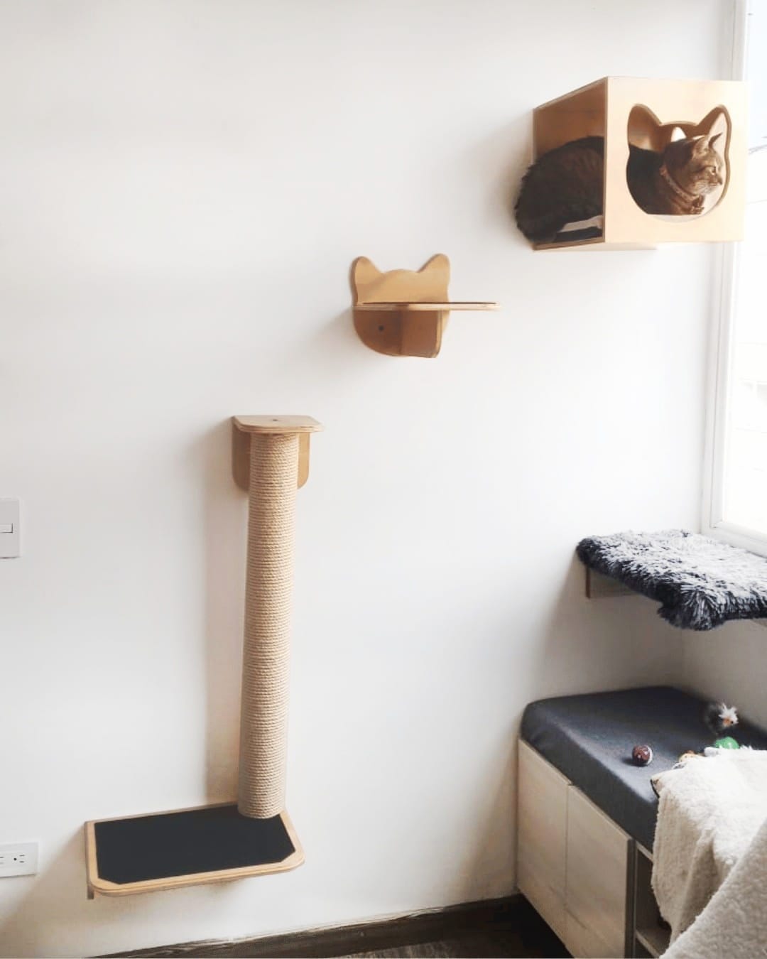 Fabricado en madera contrachapada de pino sin recubrimientos, ideal para climas cálidos o para quienes prefieren un estilo elegante y fácil de limpiar. Perfecto para ventanas o rincones altos, tu michi disfrutará de vistas privilegiadas y un lugar propio.